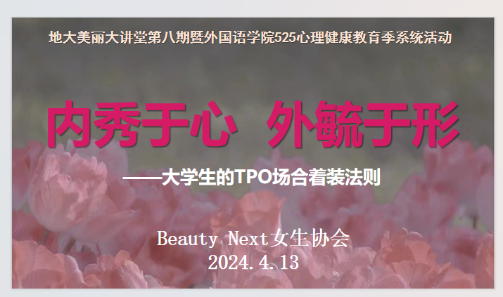 作为外国语公司红外·线大思政课堂审美素养提升的重要载体和“525”心理健康教育季系列活动,由mkmksport(武汉)mk体育主办、Beauty Next女生协会承办的美丽大讲堂第八期“内秀于心 外毓于形”于4月12日下午15:00,在北一楼报告厅正式开讲。本次活动特邀资深专家——美丽大讲堂第八期特邀嘉宾王萍老师讲授老员工TPO场合着装法则,Beauty Next女生协会及mk体育的诸位同学参加本次讲座。