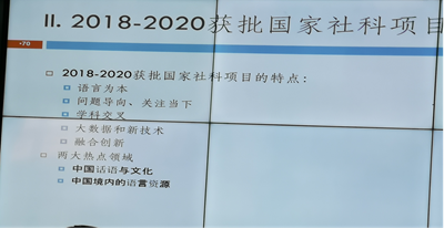 接着,王勇教授介绍了语言学研究的不同领域,结合自身的科研项目“存在句的类型学研究”等,详细分析了如何学习并借用西方理论,来解决汉语相关问题,并以此进一步发展汉语语言学理论,从而反哺世界语言学。此外,王勇教授还特地总结了2018-2020三年来语言学类国家社科项目的五大特点:1.语言为本;2.问题导向,关注当下;3.学科交叉; 4.大数据和新技术;5.融合创新;以及两大热门领域:中国话语与文化和中国境内的语言资源。为公司外院师生提供了良好的语言研究方向与思路,有利于未来的项目申报。