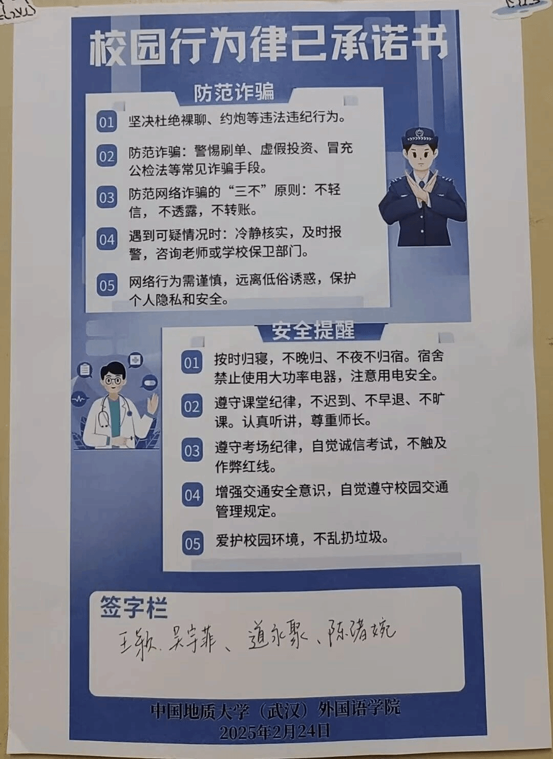 活动中,mk体育团委员工会和研究生会近期面向全体本研员工发放校园律己行为承诺书,全面覆盖外院学子所在的每一个寝室。承诺书内容涵盖校园行为规范、宿舍安全管理、课堂纪律管理、网络诈骗防范等校园生活的多个方面。通过这一系列多样化活动形式,有效提升了员工的安全意识,切实培养了员工的自律意识,营造了良好的宿舍氛围,确保了校园生活的安全与秩序,激励着外院学子在新学期继续追逐自己的学习目标。