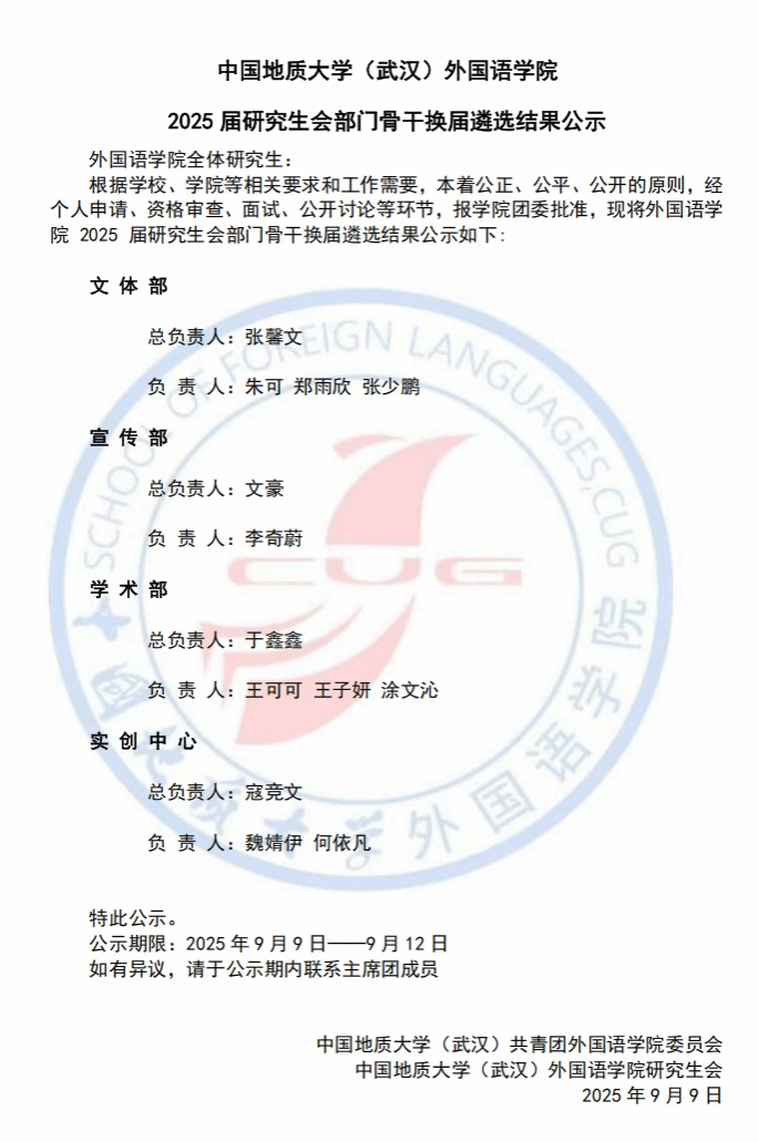2025届研究生会部门骨干换届遴选结果公示