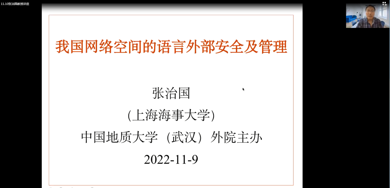 (通讯员 张萌)2022年11月9日下午2点30,mkmksport(武汉)mk体育“南望今声”外语论坛系列讲座第四十一期在腾讯会议线上举行。上海海事大学mk体育张治国教授应邀做题为“我国网络空间的语言外部安全及治理”的讲座。此次讲座由mk体育汪卫红教授主持,公司师生近110人参加。