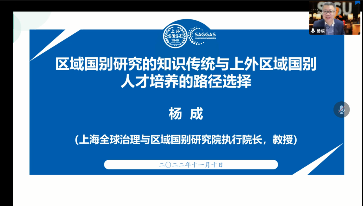 讲座过程中,杨教授首先梳理了全球范围视角下的区域国别研究的三种知识传统:欧洲殖民时期以等级制为内核、冷战时期以政治压迫为基础和以中国为代表的反帝反霸为特征,以及我国区域国别研究发展的四波浪潮。杨教授还对上外区域国别研究机构的历史发展沿革,上外前期在区域研究领域的部分理念和经验,以及叠合式交叉团队建设及人才培养模式,即课程育人、田野育人、智库育人三位一体的、基于“多语种+”和以人类学、历史学、地理学为基础的“多学科+”做了详细阐述。