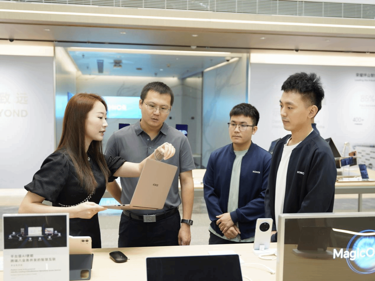 团队一行还参观走访荣耀终端全球总部和深圳市蓝天教育培训公司等两家企业。在荣耀终端,公司招聘经理赵智勇详细介绍了荣耀终端发展历程和人才理念,2024届毕业生唐湘林分享了一年来在荣耀工作的经历和收获,他在分享中提到“艰苦朴素,求真务实”的校训精神是他工作中踏实学习、务实发展的动力源泉,快速调整、快速适应、快速反应是他能不断成长的重要因素,他期待更多的学弟学妹加入荣耀。双方就校企人才培养模式与岗位能力适配性进行了深入探讨,余尚蔚代表公司感谢企业对公司毕业生的培养,并邀请企业秋招到公司开展就业育人和校园招聘。