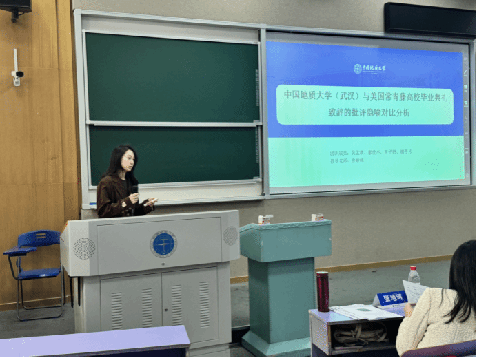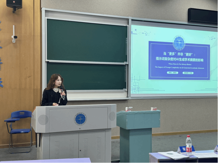 报告会正式开始,12组汇报人依次登台,论文选题与时俱进,紧跟国家发展方向,涵盖翻译传播、跨文化交际以及AI大语言模型等多个研究领域。